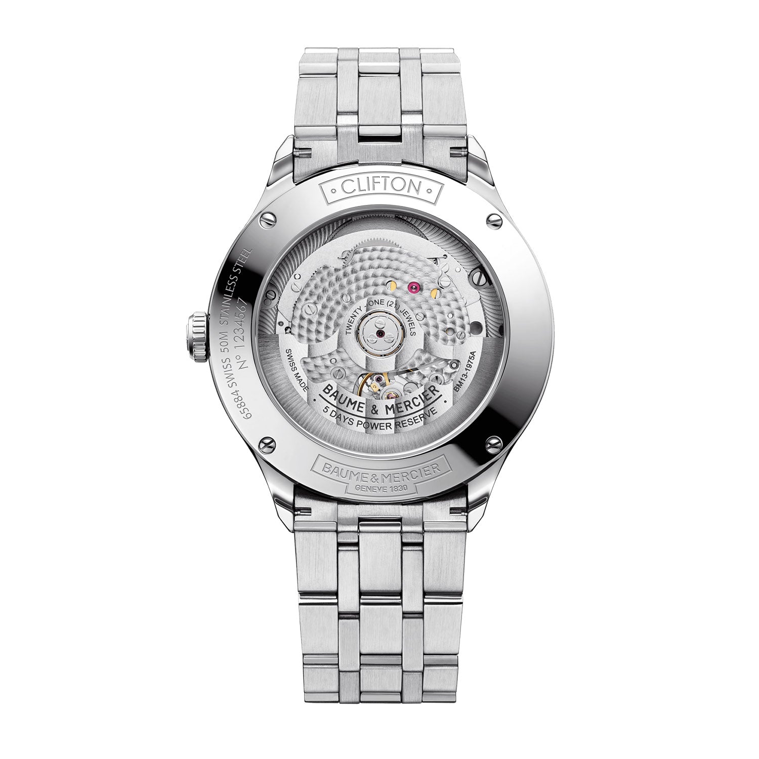 A 40 mm stainless steel date watch for men, the Clifton Baumatic 10505 epitomizes the modern urban-chic aesthetic. A crisp white dial with the iconic date aperture. A powerful, yet luxuriously comfortable metal bracelet with triple folding clasps. The clean lines of simple, polished time markers and rhodium-plated hands. This is the mechanical self-winding timepiece for those with an appreciation for masculine refinement.