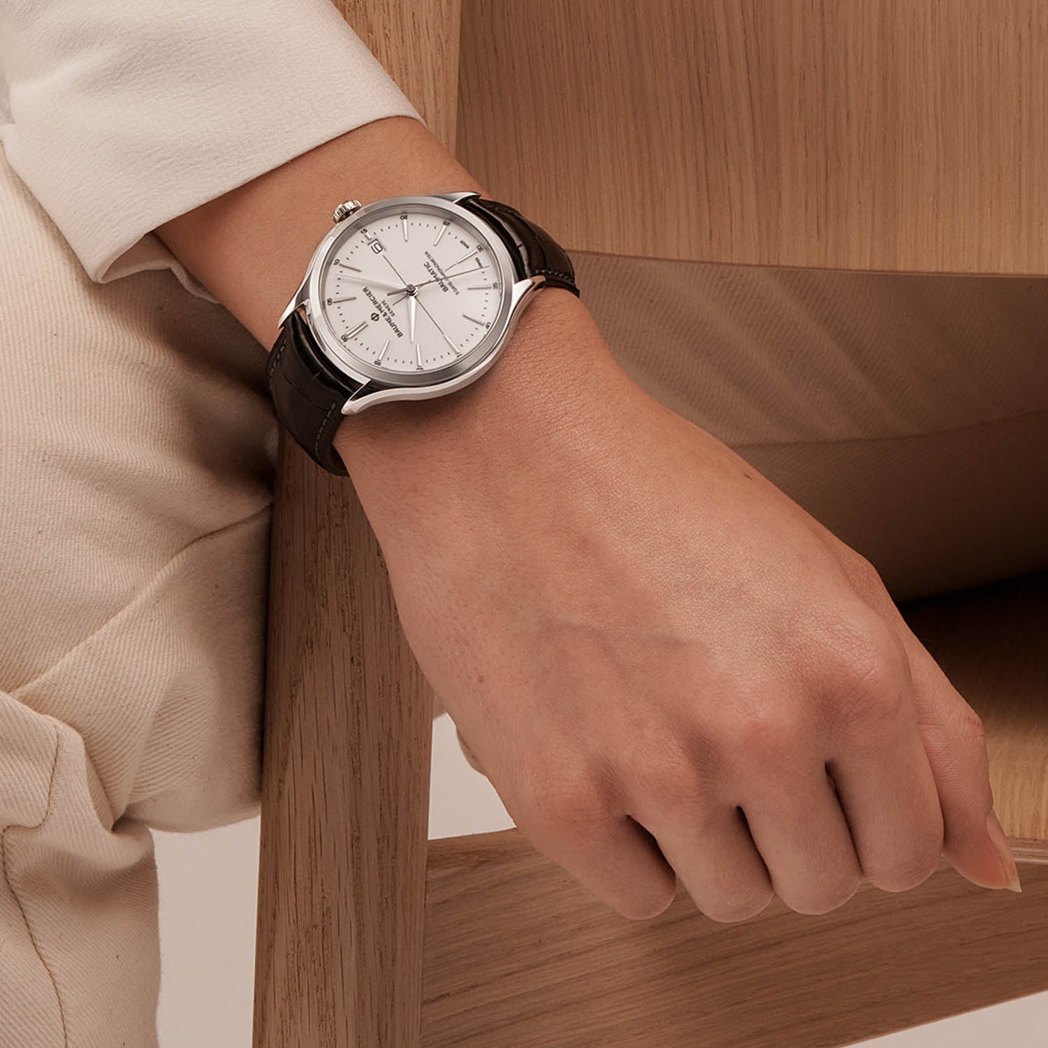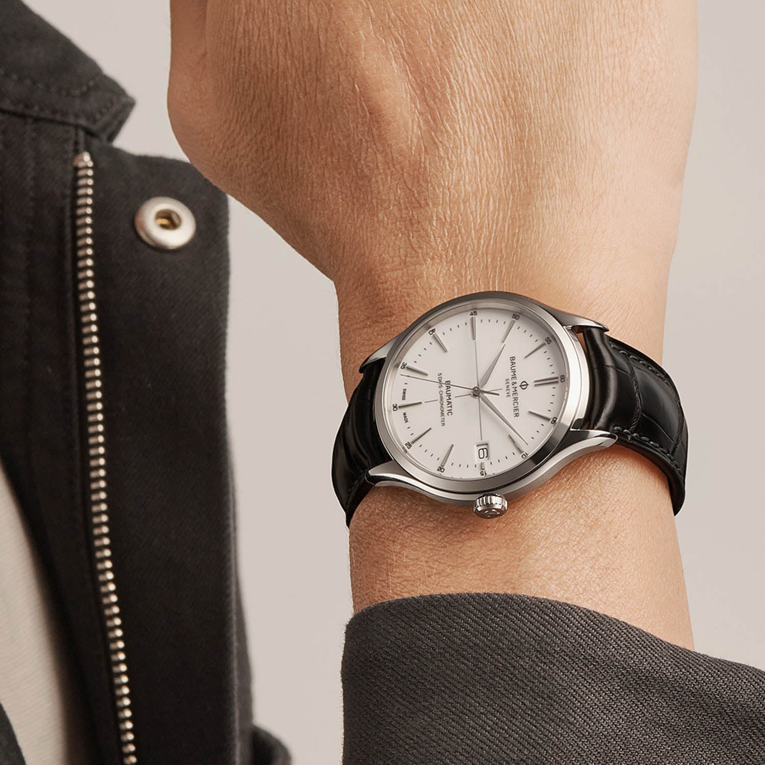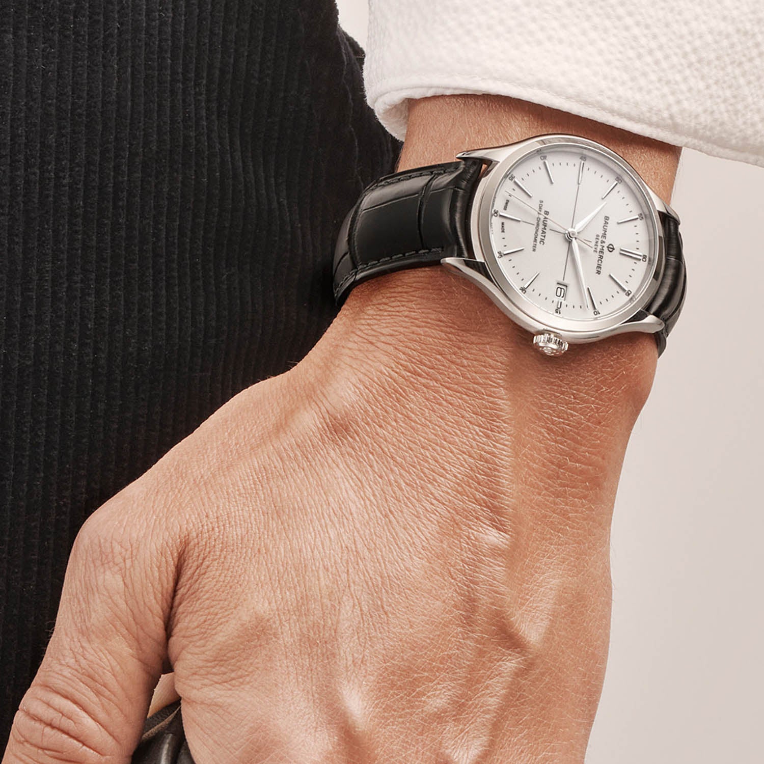 A sophisticated gentleman's wristwatch, the Clifton Baumatic 10518 is an automatic date watch for men, manufactured with a manufacture self-winding calibre. Its balanced aesthetic pairs a timeless black alligator strap with a white dial, featuring both hour and minute time markers and the iconic date aperture at 3 o'clock. The steel case is finished with a transparent sapphire case back, through which the COSC automatic movement can be observed.
