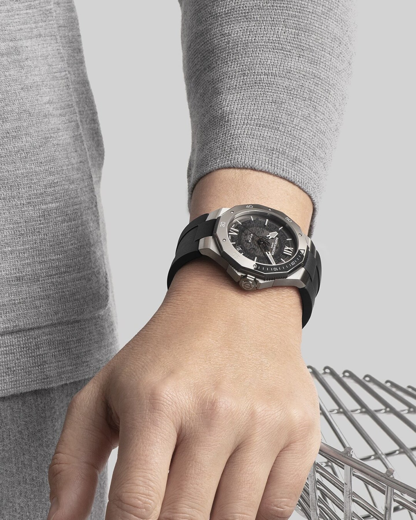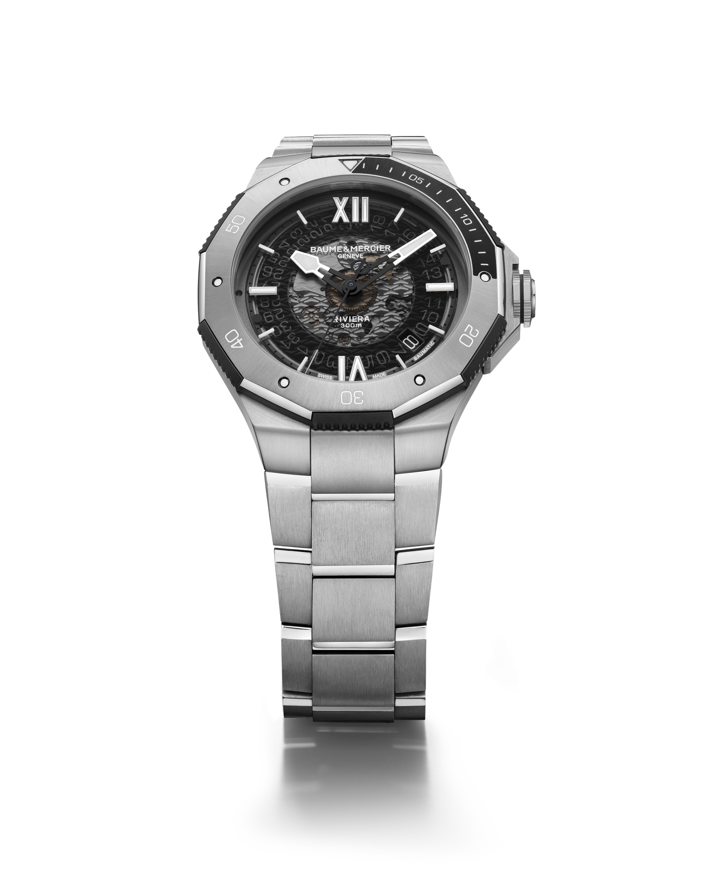 Driven by the prestigious Baumatic manufacture calibre, the Riviera 10717 is the all-road Swiss timepiece by excellence. Its transparent smokey grey sapphire dial, its unidirectional rotating bezel and its black anodized aluminum ring complete the sporty look of this "Swiss-Made" timepiece. The ideal watch for water sports.