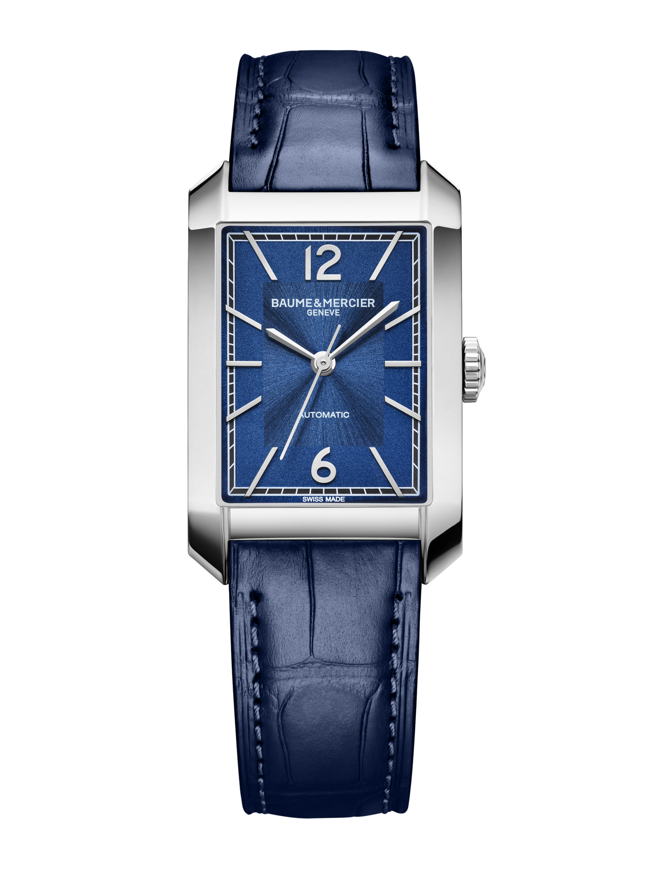 This automatic timepiece balances urbane style with excellence in watchmaking. It comes with 21 internal jewels and 38 hours of power reserve. The sleek rectangular stainless steel case is complemented by an opaline and sun satin-finished blue dial.