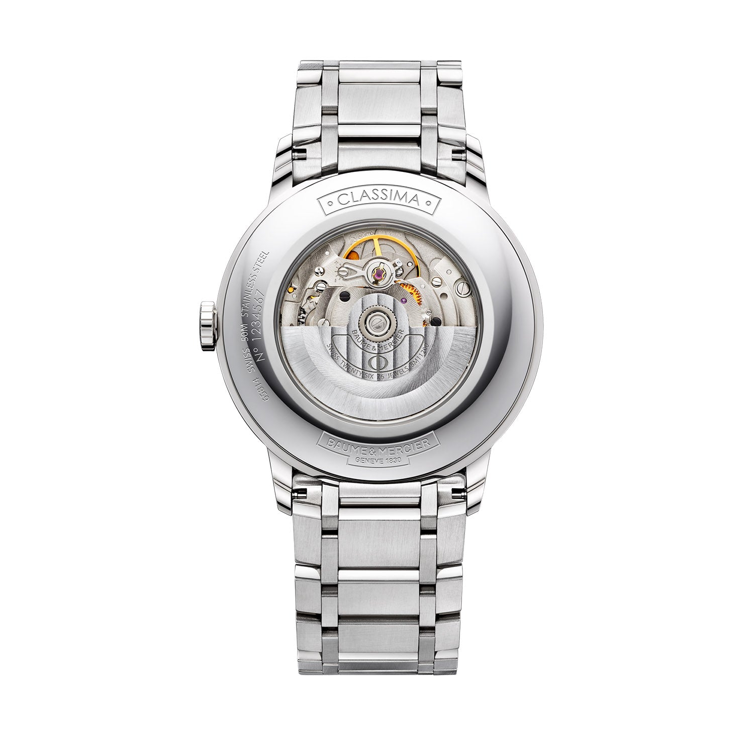A classic stainless steel automatic watch with iconic line guilloché decor and masculine blue steel hands, the Classima 10334 is the luxury timepiece to suit the tastes of the modern urban professional. The 42 mm round watch is powered by mechanical self-winding movement, visible beneath the scratch-resistant sapphire crystal case back. It features Roman numerals to mark the hours as well as black minute and second indicators around the edge of the silver dial and a polished steel bracelet.