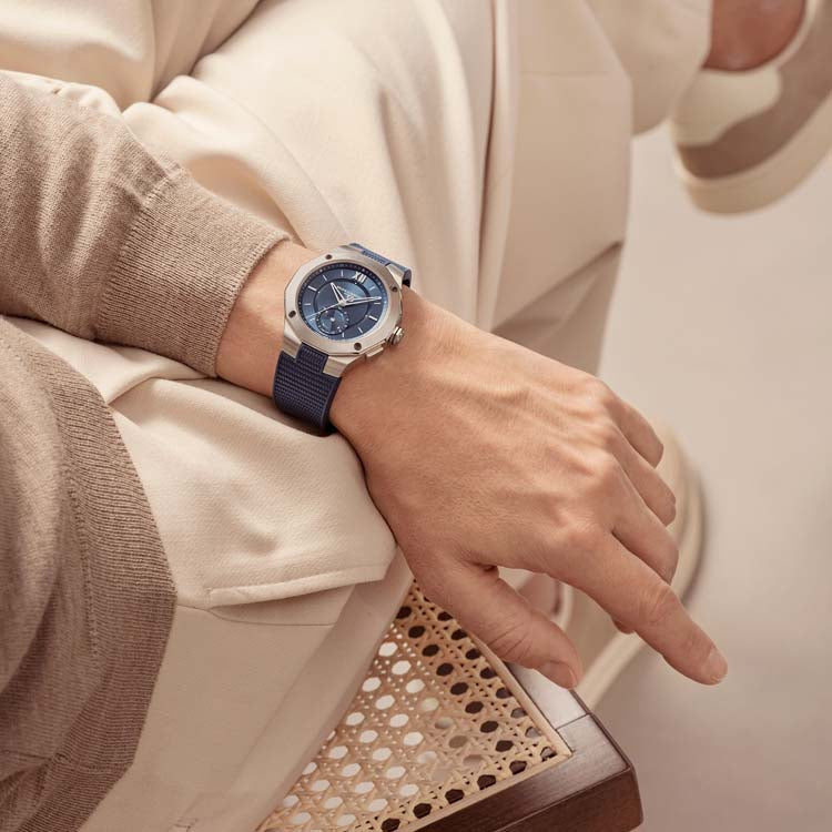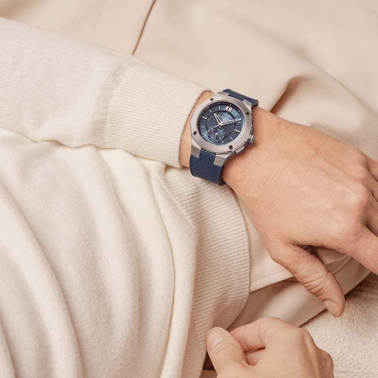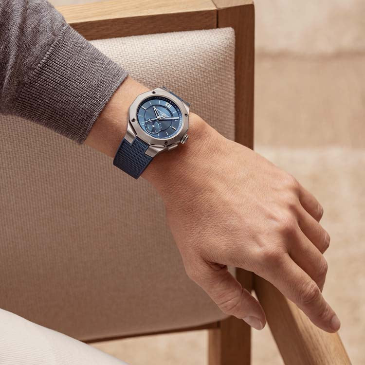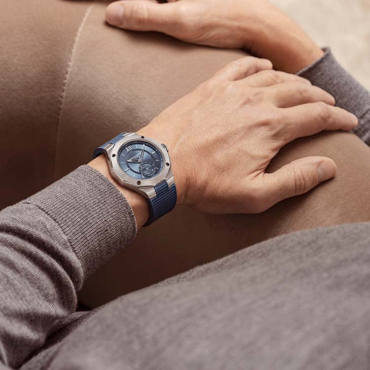 The Riviera Baumatic Tideograph, limited to 500 pieces, embodies the sailing spirit with its blue design and tide-measuring abilities. The 43mm stainless steel case houses a manufacture Baumatic movement ensuring precision and durability, complemented by a blue rubber strap with an interchangeable mechanism. The harmonious blue dial adorned with Roman numerals displays tide information at 6 o’clock.