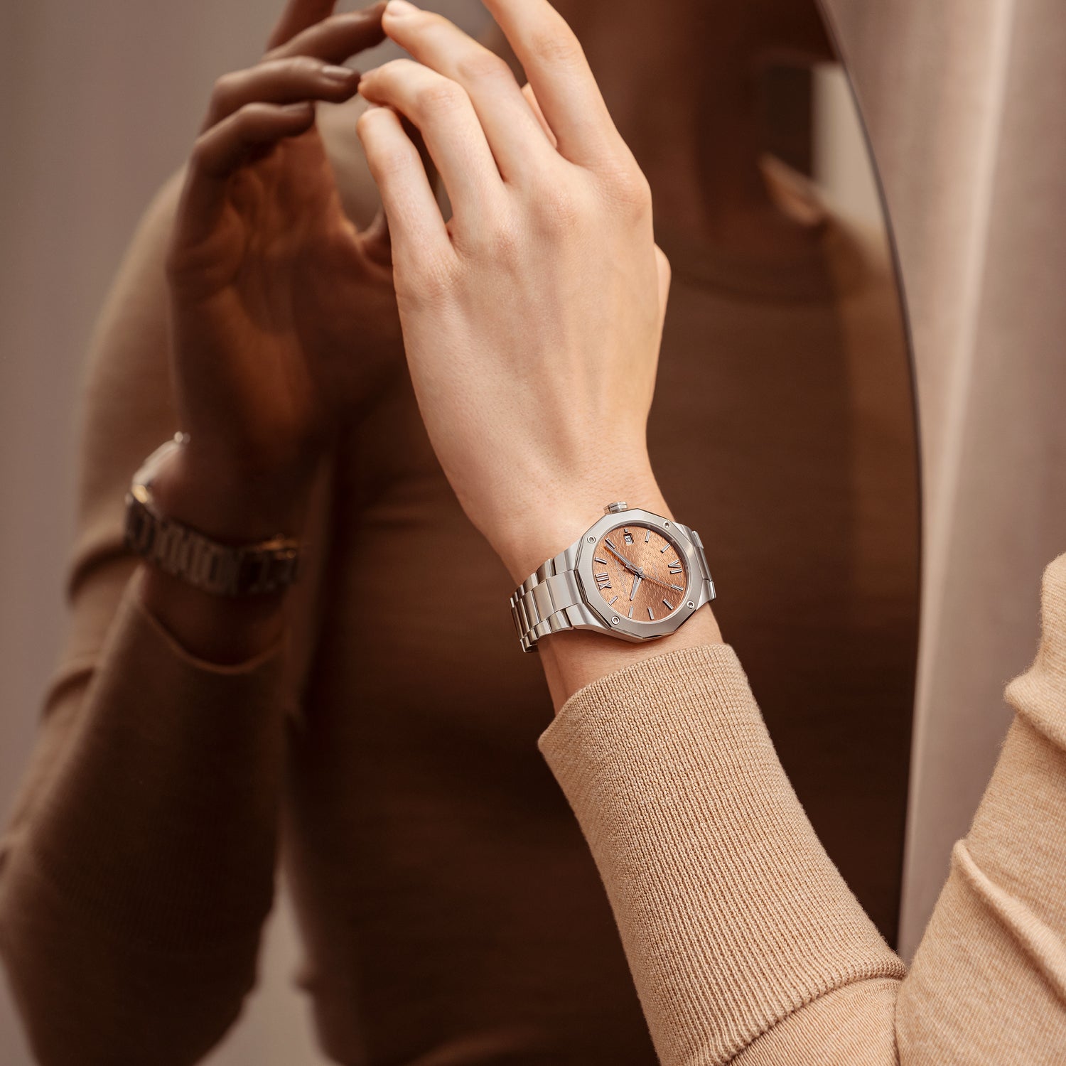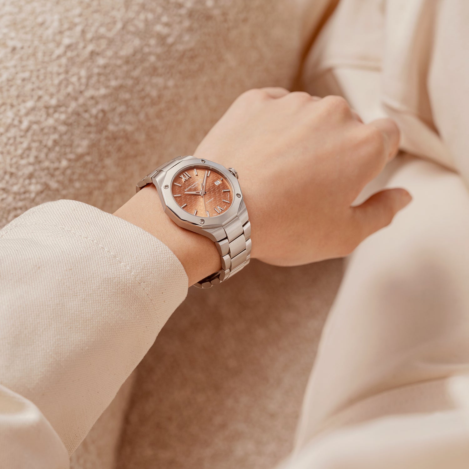 This Riviera in 36mm is equipped with an automatic movement for active and independent women. Combining the signature dodecagonal case, a terracotta-coloured dial with décor, and a metal interchangeable bracelet, this timepiece offers an off-beat elegance and Swiss precision.