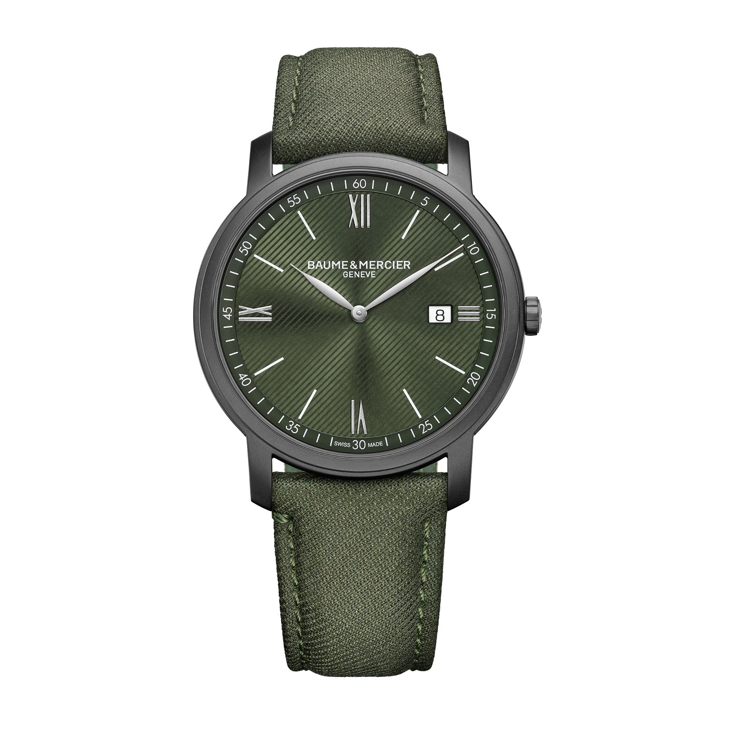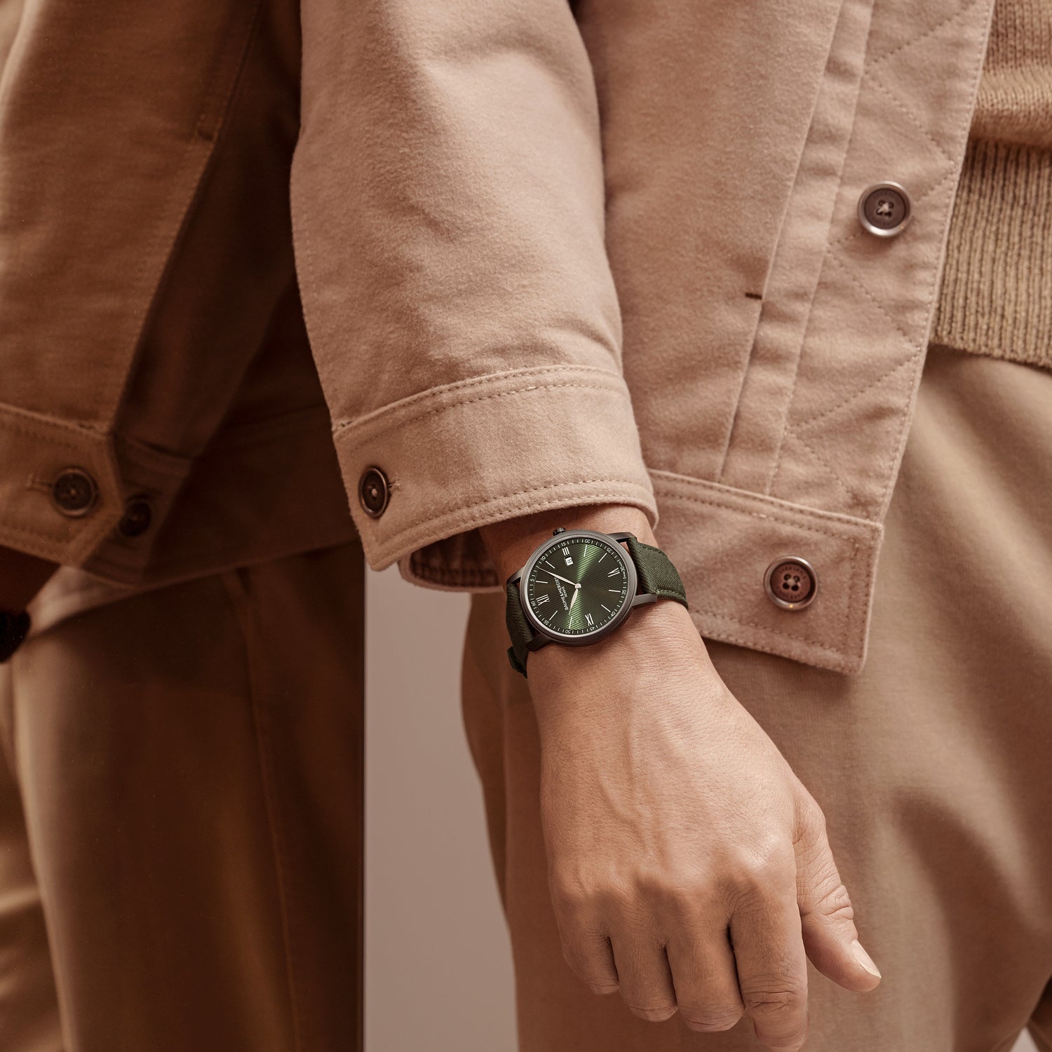 Embark on adventures with this watch powered by a quartz movement, offering 5 years of reliability. Encased in a 42mm sandblasted steel-ADLC case, its opaline green dial exudes rugged elegance. Paired with an interchangeable green fabric strap from Holland & Sherry, it's ready for any journey with its dependable lug system for easy strap changes.