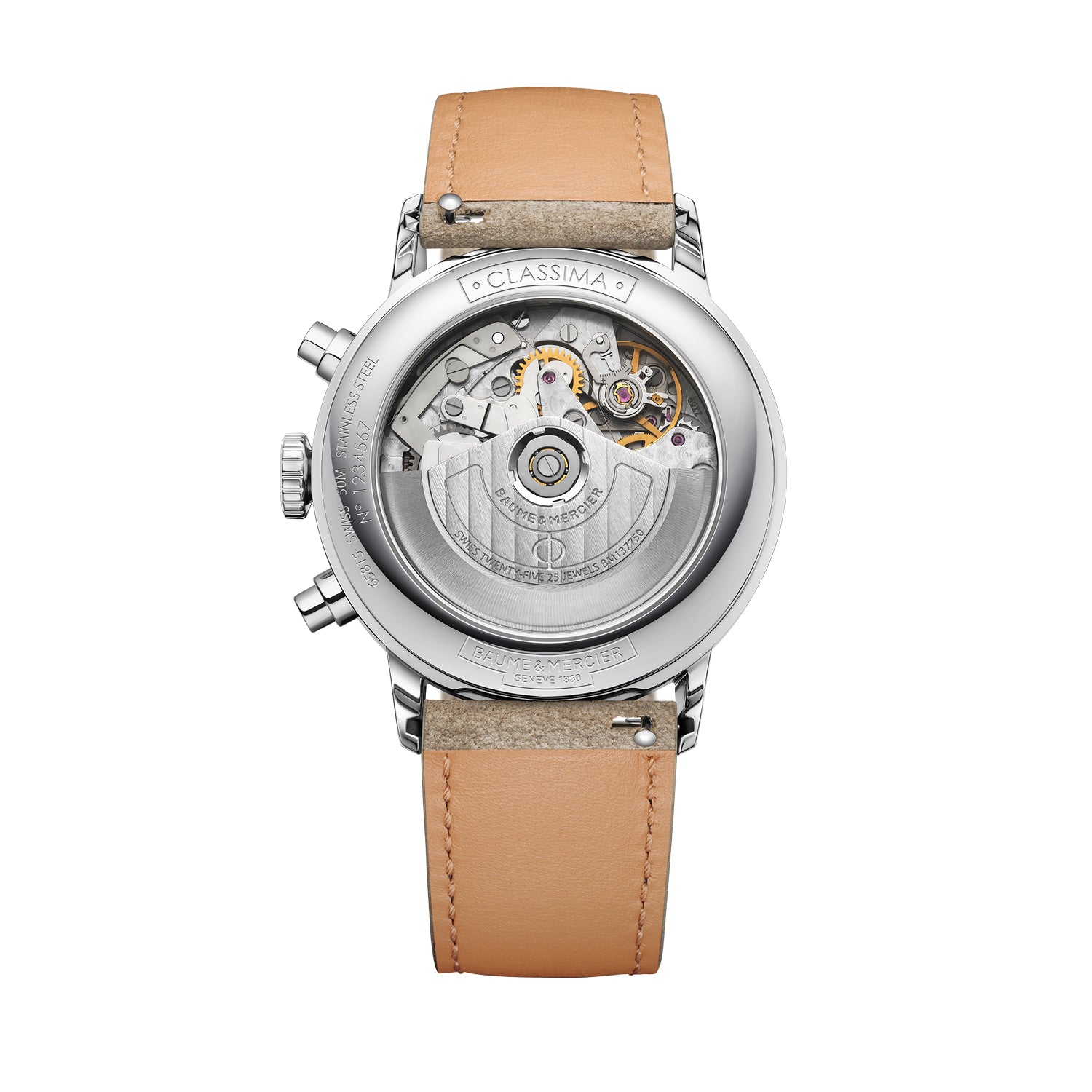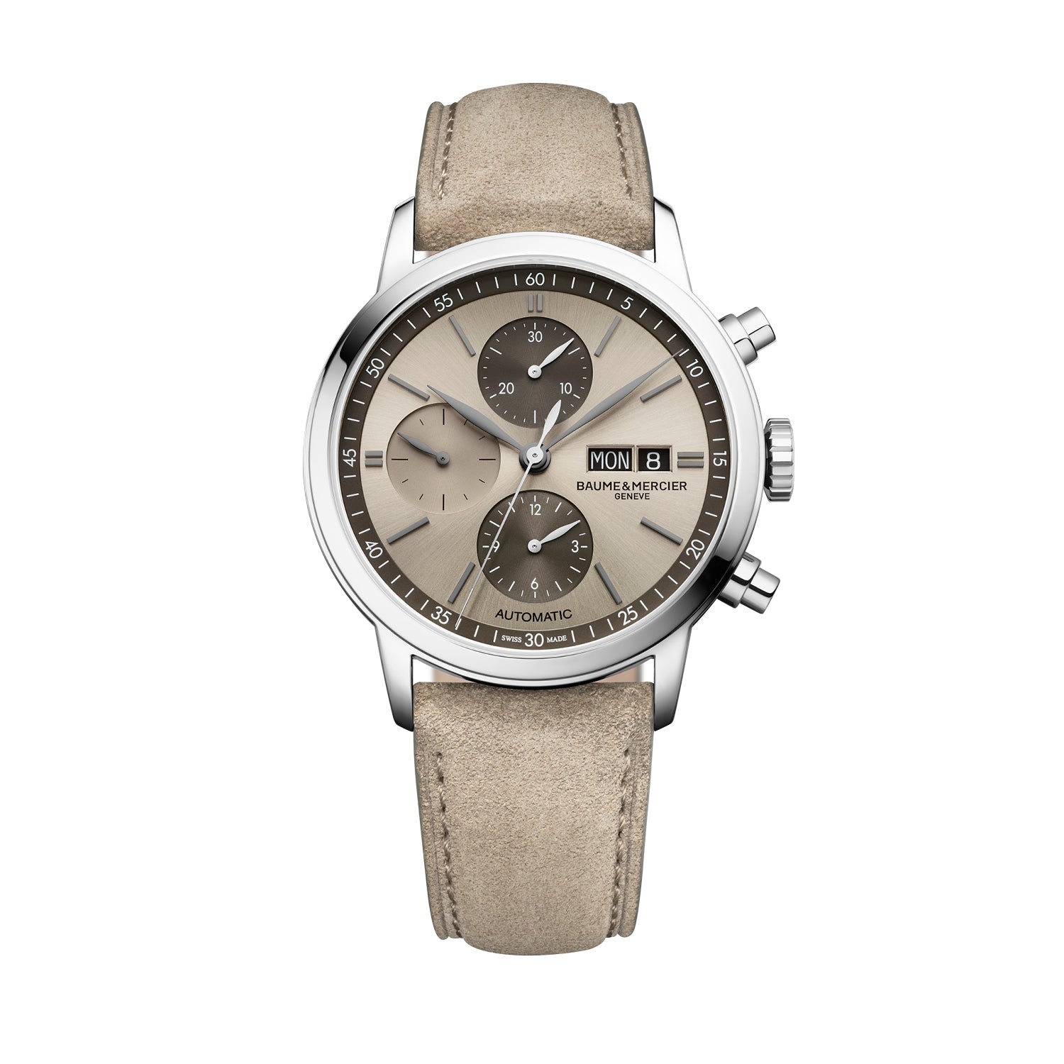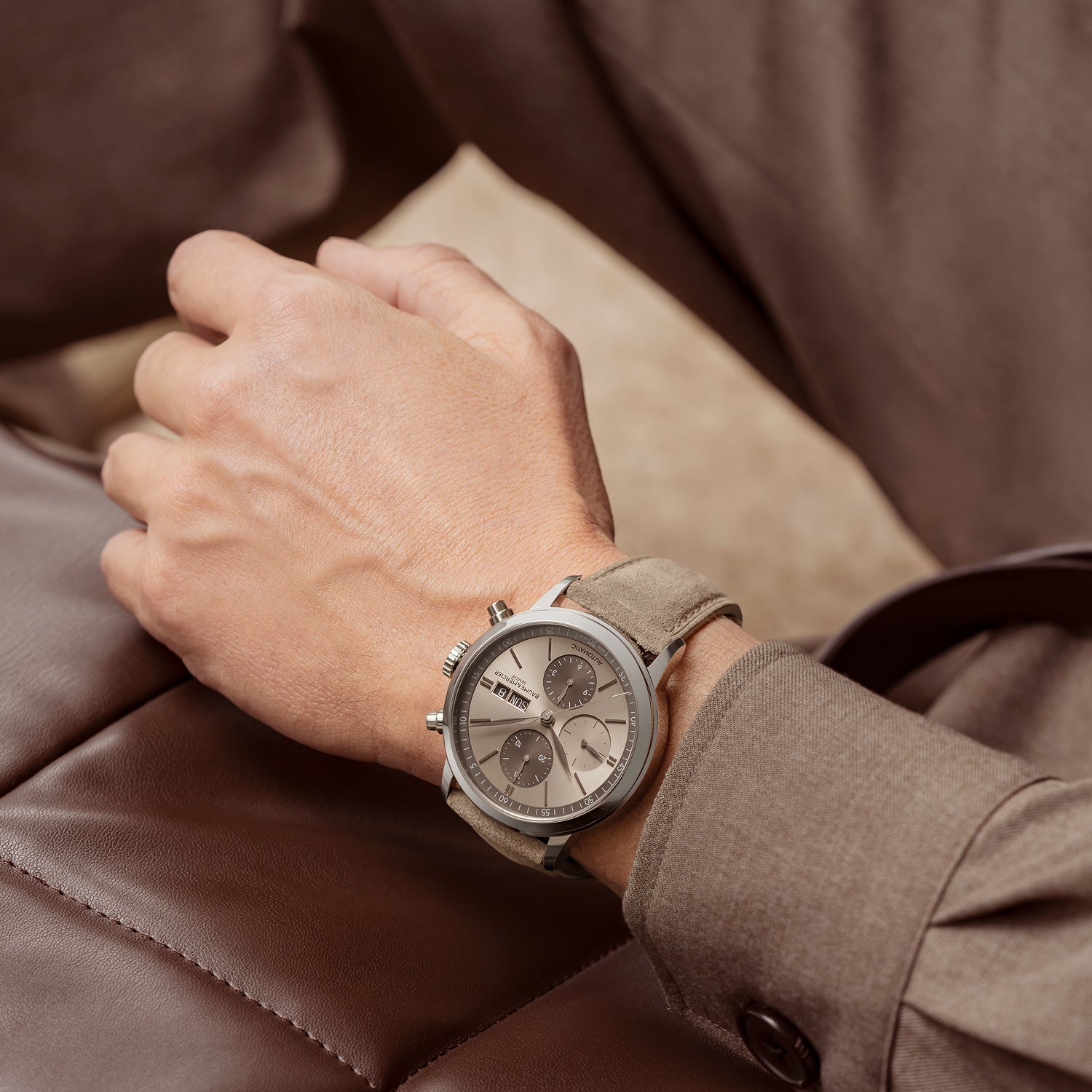 The Classima 10782 boasts a sophisticated design with a sand-coloured sunburst dial, anthracite accents, and azure sub-dials. Housed in a 42mm polished stainless steel case, this Classima Chronograh features day and date windows, a self-winding movement, a 48-hour power reserve and 5 ATM water resistance. It features an interchangeable sand-colored suede calf leather strap and stainless steel folding clasp.