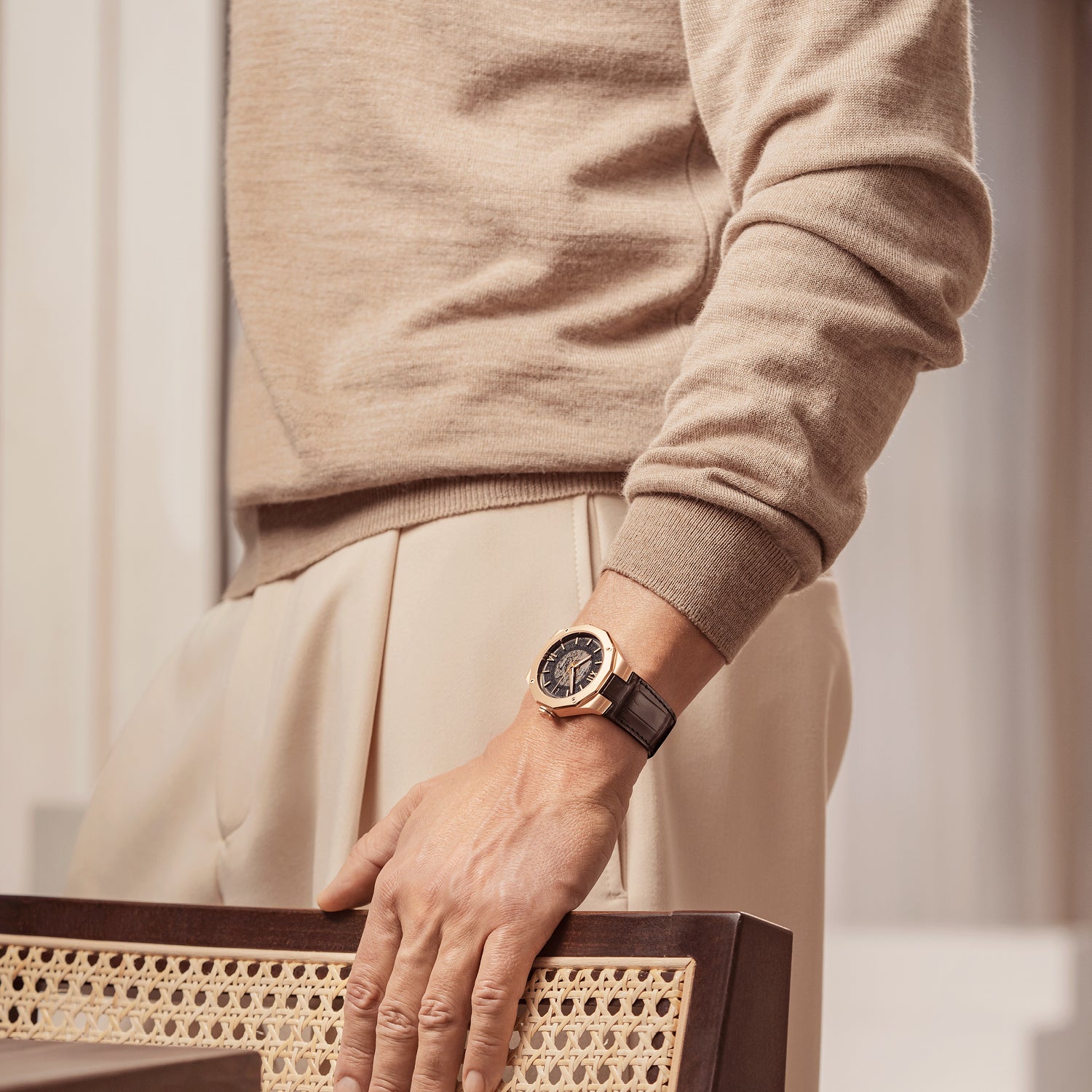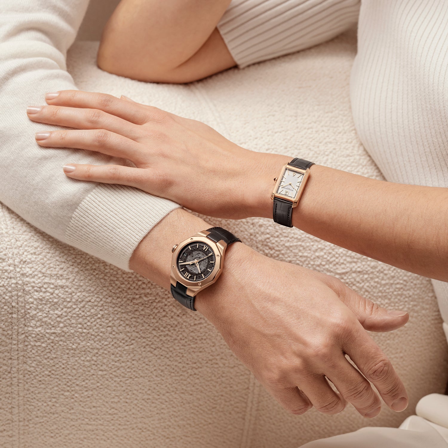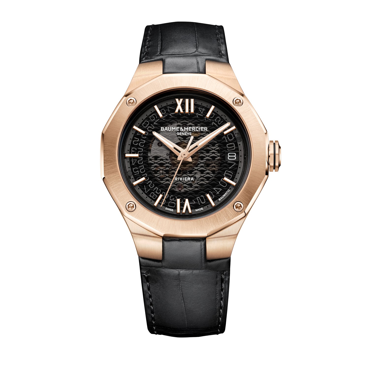 The Riviera 10787 features a satin-polished rose gold (750/1000) dodecagonal case paired with a transparent black sapphire dial. The proportions of this elegant timepiece show the perfect balance that Baume & Mercier always seeks: 39 mm in diameter and 9.6 mm in thickness. The sophistication of the polished and sun-satin rose gold (750/1000) bezel – fastened with four rose gold (750/1000) screws – extends to its free octagonal crown, also crafted in rose gold (750/1000) and adorned with the embossed black-lined brand emblem, the Phi logo.