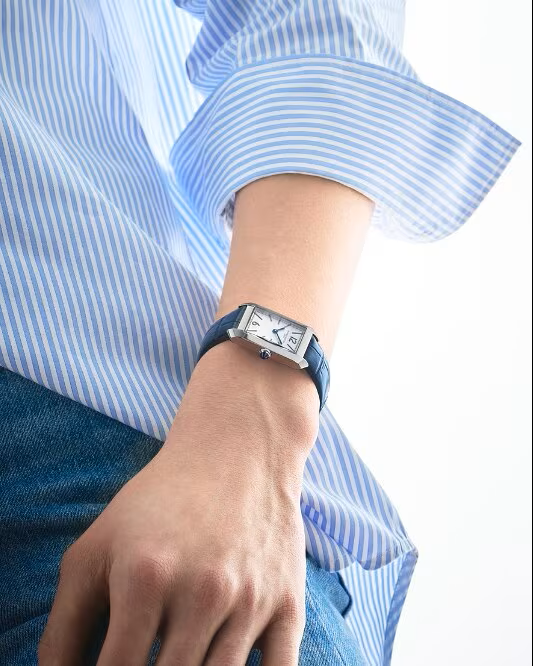 The Hampton 10795 is adorned with a silvery-white opaline dial with riveted rhodium-plated Arabic numerals and indexes and blue sword-shaped hands. It features a rectangular polished stainless steel case with a steel cabochon-shaped crown and a blue synthetic spinel incrusted. The interchangeable black leather strap with alligator pattern features a reliable system for tool-free changes.