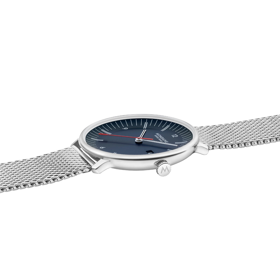 This 41mm Doppio watch set combines a harmonious blend of vintage charm and sleek minimalism. Its standout feature is the concave blue circular-brushed dial, paired with a double-domed sapphire crystal for striking depth and light interplay. The design plays with the concept of duality featuring double lines on the hands and indexes and on the tip of the second-hand. The watch is powered by a Swiss Quartz movement and boasts the original 1951 MONDAINE logo engraved on the case back, celebrating its rich heritage. The date window and water-resistance up to 5 ATM add practical functionality to the timepiece. The case is crafted from polished 316L stainless steel containing up to 91% recycled material, showcasing MONDAINE’s commitment to sustainability. This set comes with a blue vegan apple leather strap and an additional stainless-steel mesh strap allowing you to easily change the look of your watch. The timepiece seamlessly merges heritage with innovation reflecting yet again its chore theme of duality.