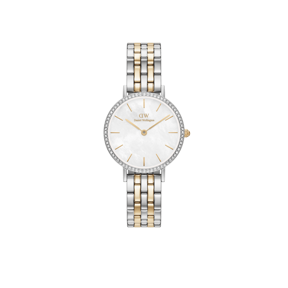 Daniel Wellington Petite 28 Bezel 5-Link White Mother of Pearl Two-Tone Gold & Silver Watch