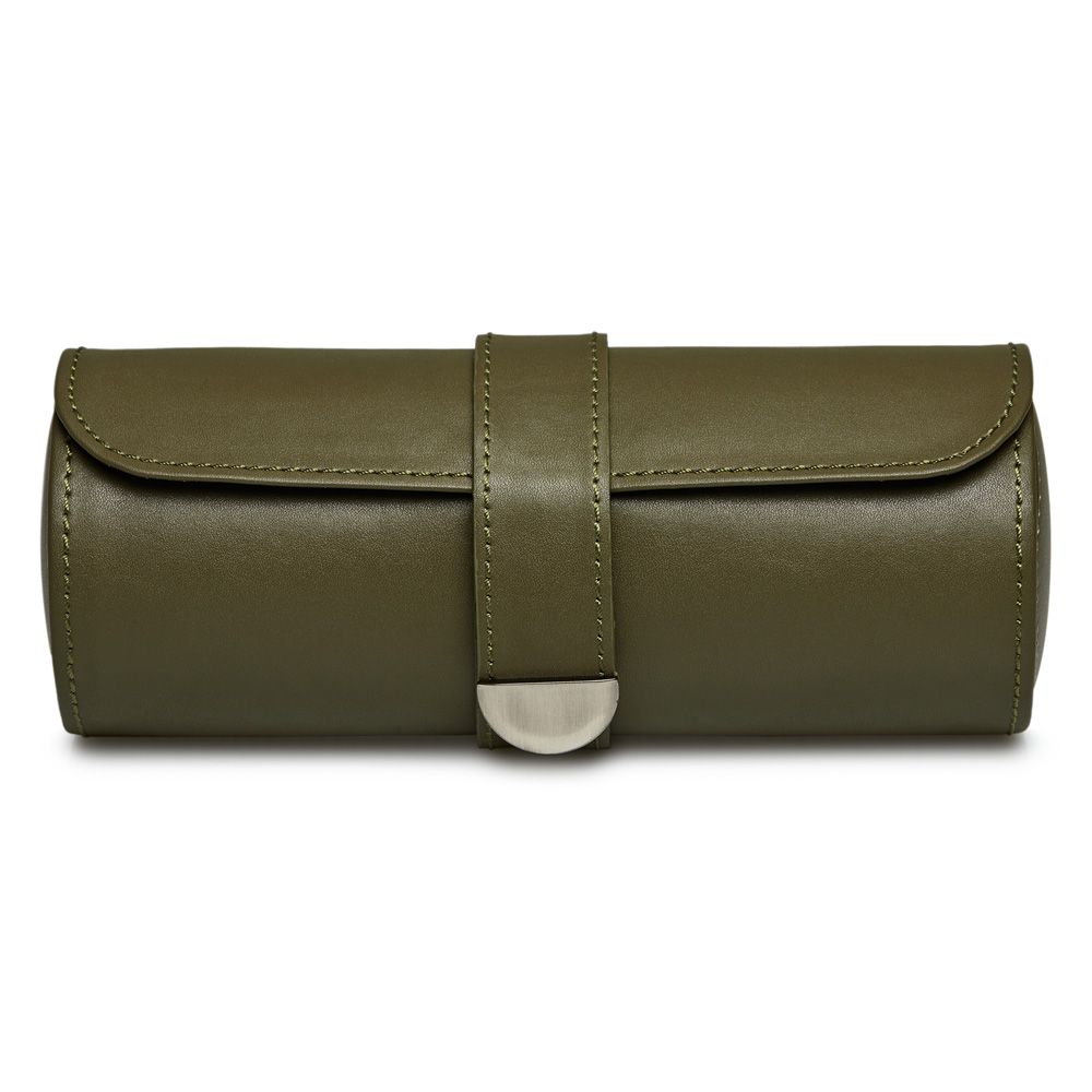 Earth Triple Watch Roll has an apple leather exterior with matt metallic closure. Inside find a recycled satin jacquard interior featuring the WOLF signature design which offers storage for up to three watches. Two watch guards positioned between your watches prevents scratching during travel and the hidden capsule with three compartments is perfect for your cufflinks, rings and other small accessories.