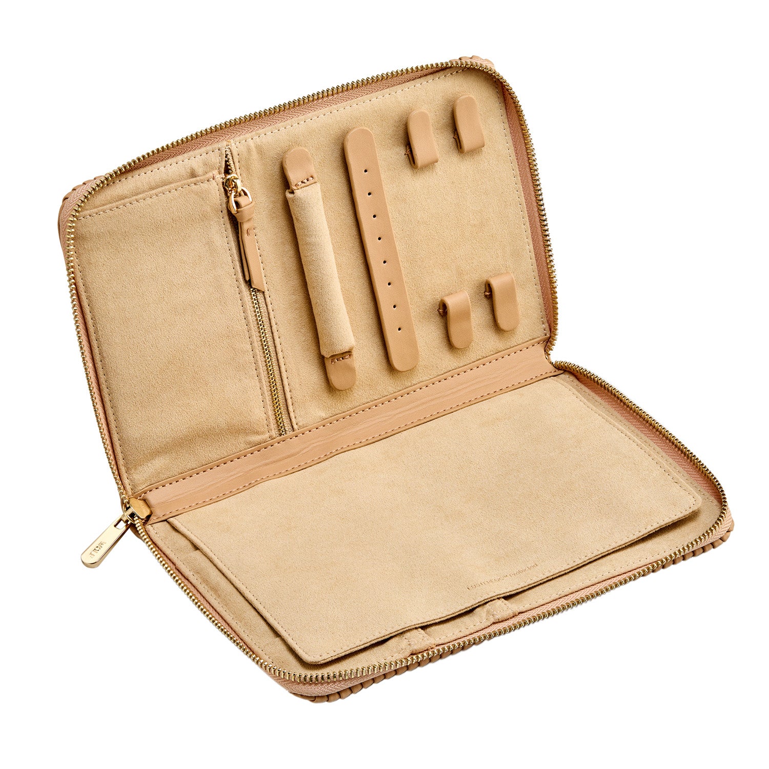 The Bella Jewellery Portfolio brings opulence and sophistication with perfectly pleated exterior and gold finish hardware. Inside find LusterLoc™ lined storage for rings and earrings, a zip compartment, 5 necklace and 4 bracelet snap closure hooks with elasticated pouches to prevent tangling. Simply beautiful.