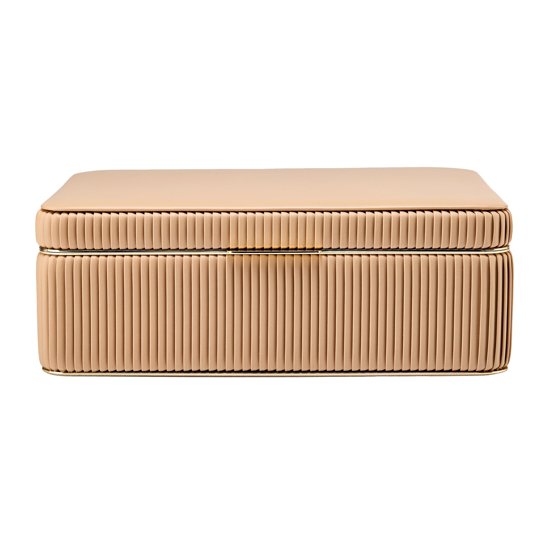 The Bella Large Jewellery Box brings opulence and sophistication with her smooth vegan leather lid, perfectly pleated sides and gold finish interior frame and hardware. Inside find three LusterLoc™ lined removable jewellery trays with 16 compartments for necklaces, rings, bracelets and earrings, a large open storage area as well as space for an extremely useful removable vegan leather zip pouch with 4 individual pockets to separate and protect your jewellery. Simply beautiful.