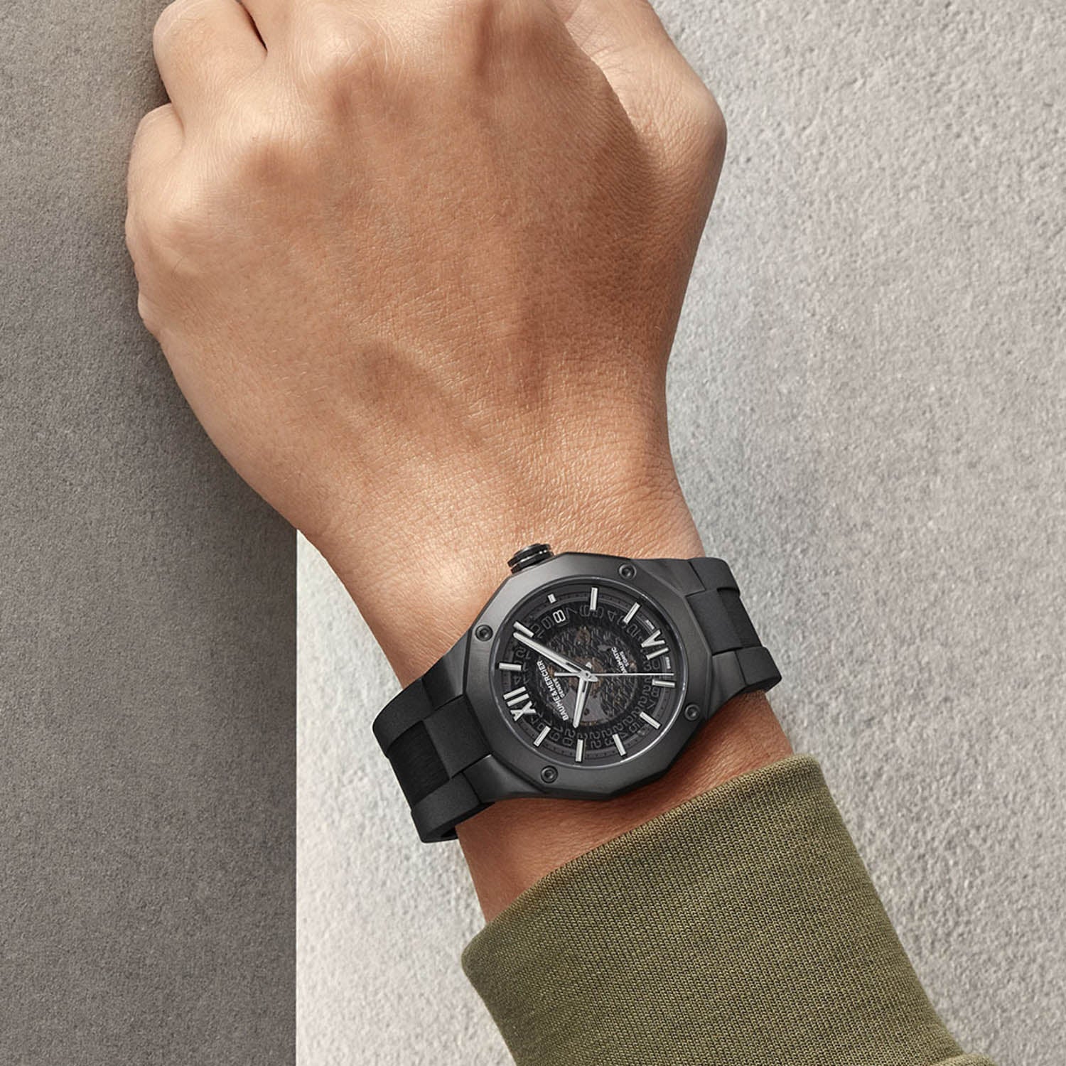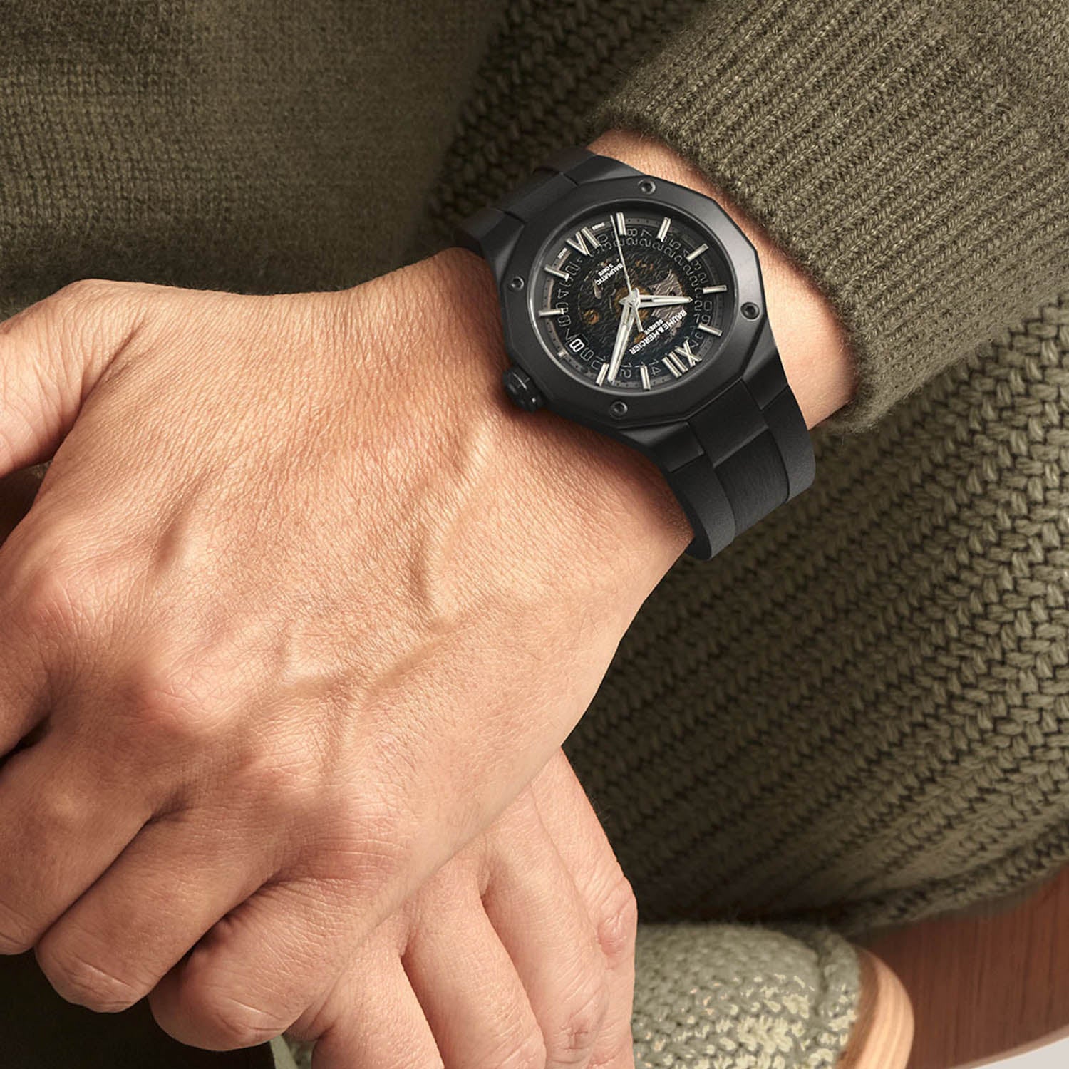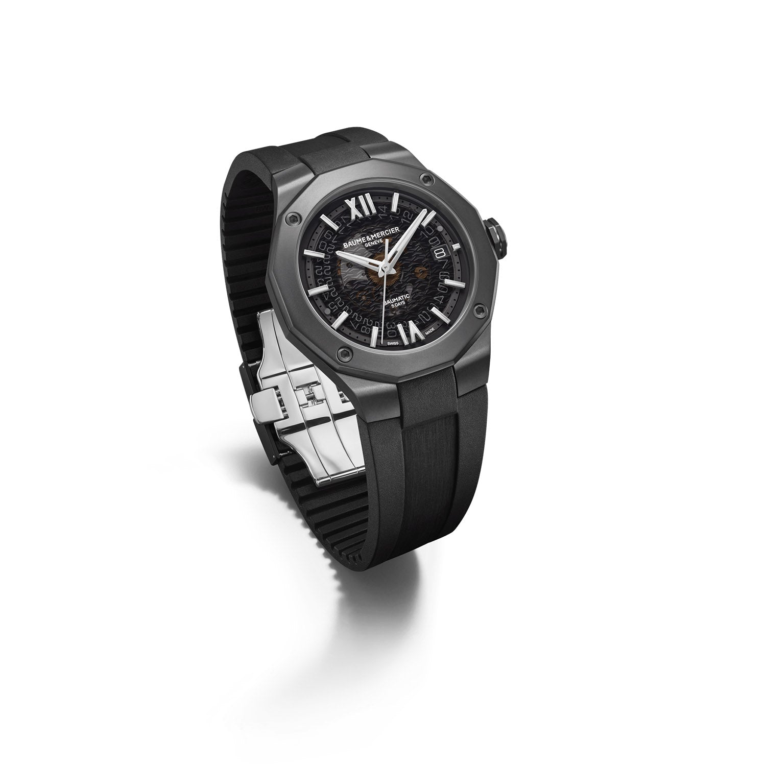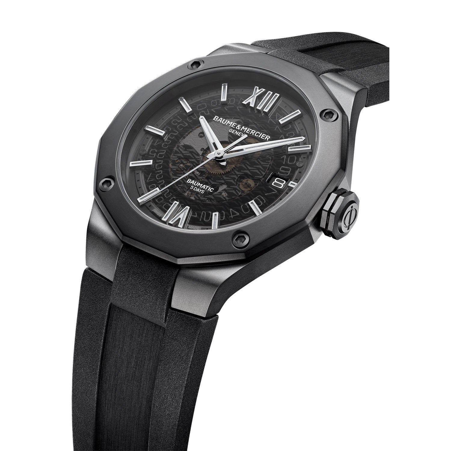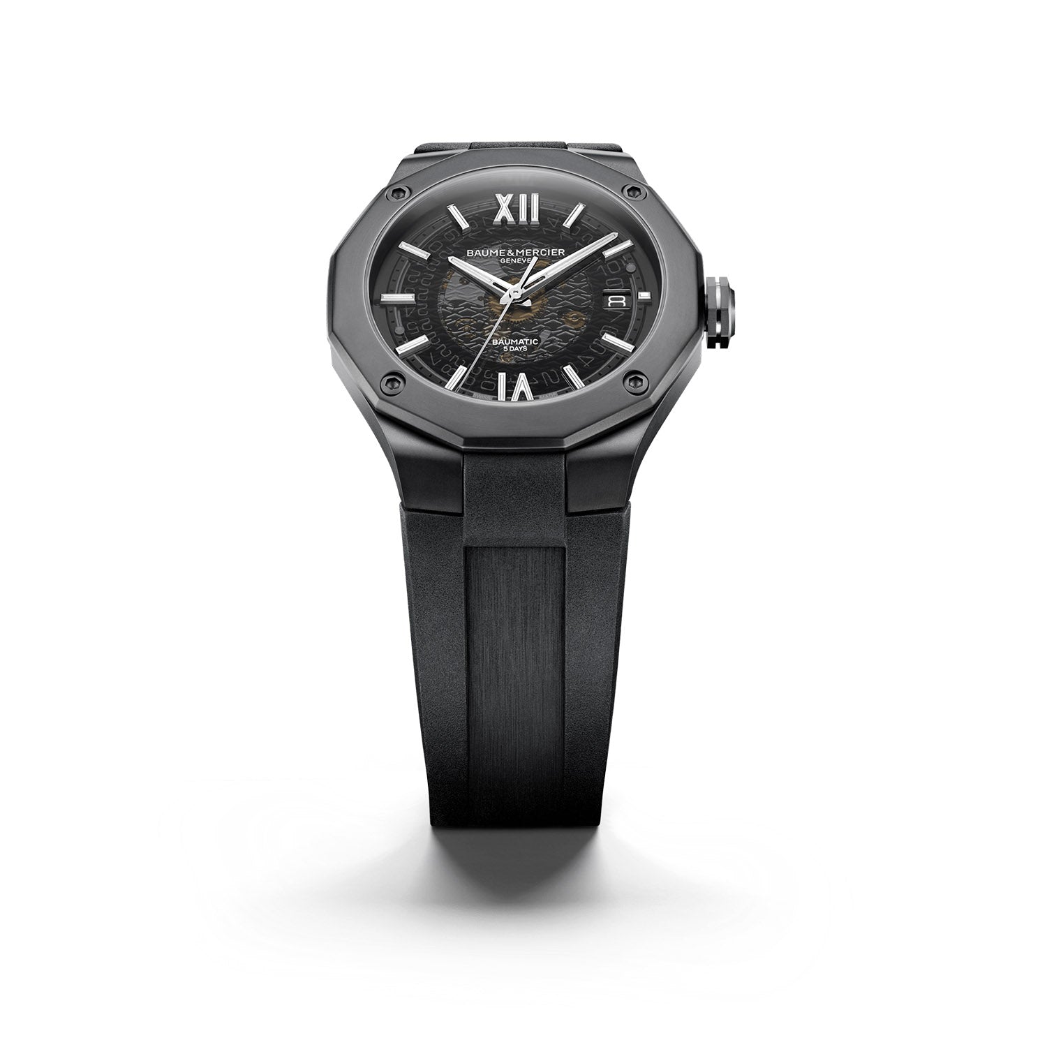 Driven by the prestigious Baumatic manufacture calibre, the Riviera 10617 is the subtle combination of refined and sporty look. Displaying a smoked sapphire gray dial and a black steel-ADLC dodecagonal case, this distinctive silhouette is finished with a black rubber strap for an ultimate black look.