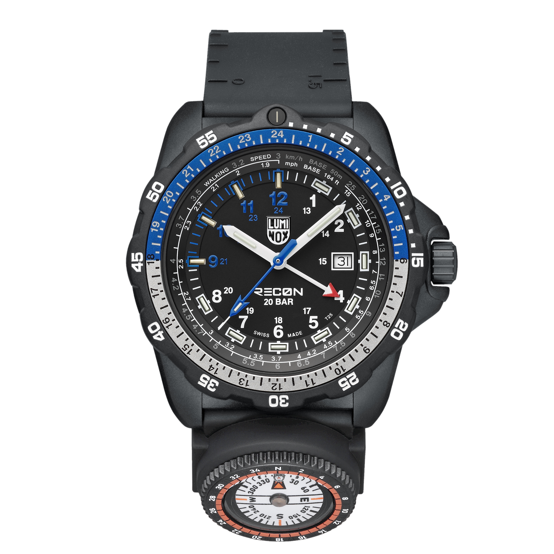 Built in collaboration with tactical specialist Andrea Micheli, this rugged 46 mm timepiece is engineered for precision navigation. The XL.8837.SET is constructed from a lightweight yet ultra-durable CARBONOX™ case and a unidirectional rotating bezel with a two-tone aluminium ring insert. The indexes 9-12 and the second hand in grasshopper green create an interesting colour highlight. The dial is protected by a sapphire crystal with anti-reflective coating, and the watch is water resistant up to 200 metres. Powered by a Swiss quartz GMT movement, the XL.8833 lets you track two time zones simultaneously perfect for global missions or international travel. The black nitrile rubber strap includes integrated map scales and ruler markings, plus a detachable compass, transforming the watch into a complete navigation instrument. This set comes with an additional grasshopper green webbing strap for added versatility. Thanks to Luminox Light Technology, the XL.8837.SET remains visible in all light conditions with a constant glow lasting up to 25 years.