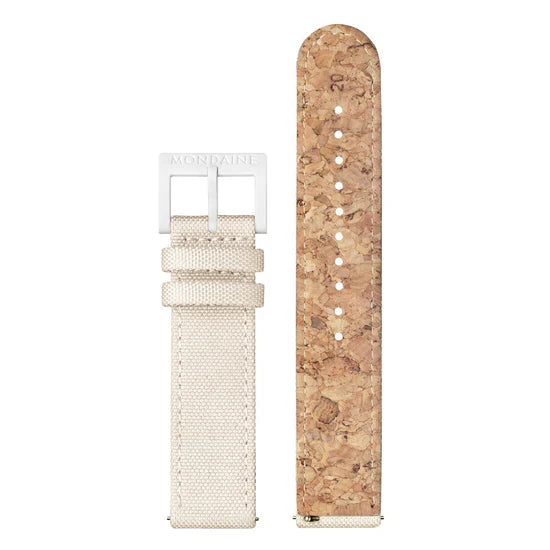 Powered entirely by light, the Mondaine essence solar combines iconic Swiss design with modern sustainability. At its heart beats a Swiss Made Ronda solar movement, charging through any light source and running for up to 8 months even in complete darkness once fully charged. The 41mm case is crafted from a renewable castor oil composite, while the strap is made from recycled PET textile with a natural cork lining for comfort. With its crisp white dial, bold black markers, and the signature red seconds hand, this timepiece is both timeless and forward-thinking - designed to last, responsibly.