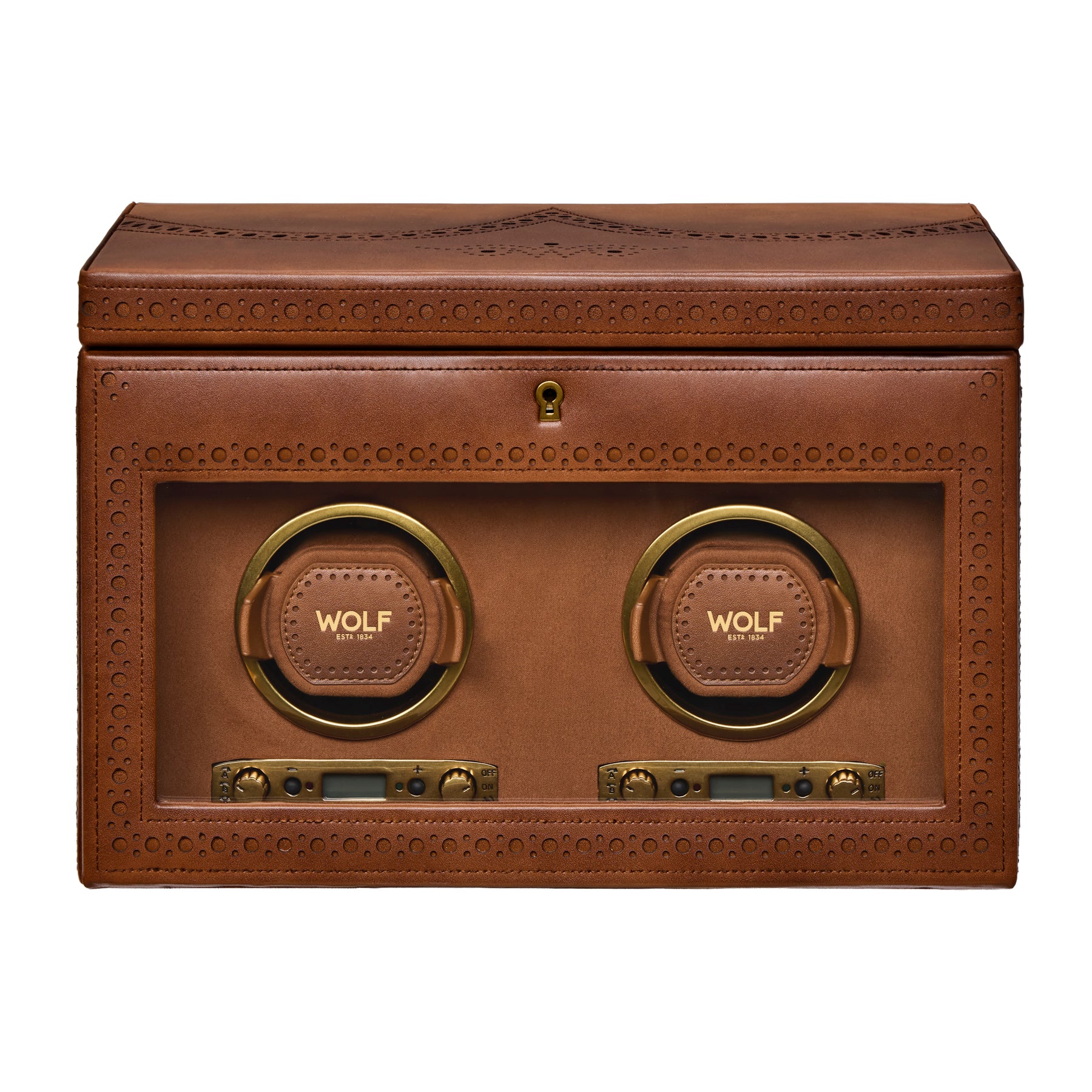 Brogue Double Watch Winder was inspired by the traditional brogue patterns on handmade English shoes, made of tan burnished plant-based material and old English brass finish hardware with refined storage, precise TPD control, Lock-in Dynamic Cuff, and return-to-start technology.