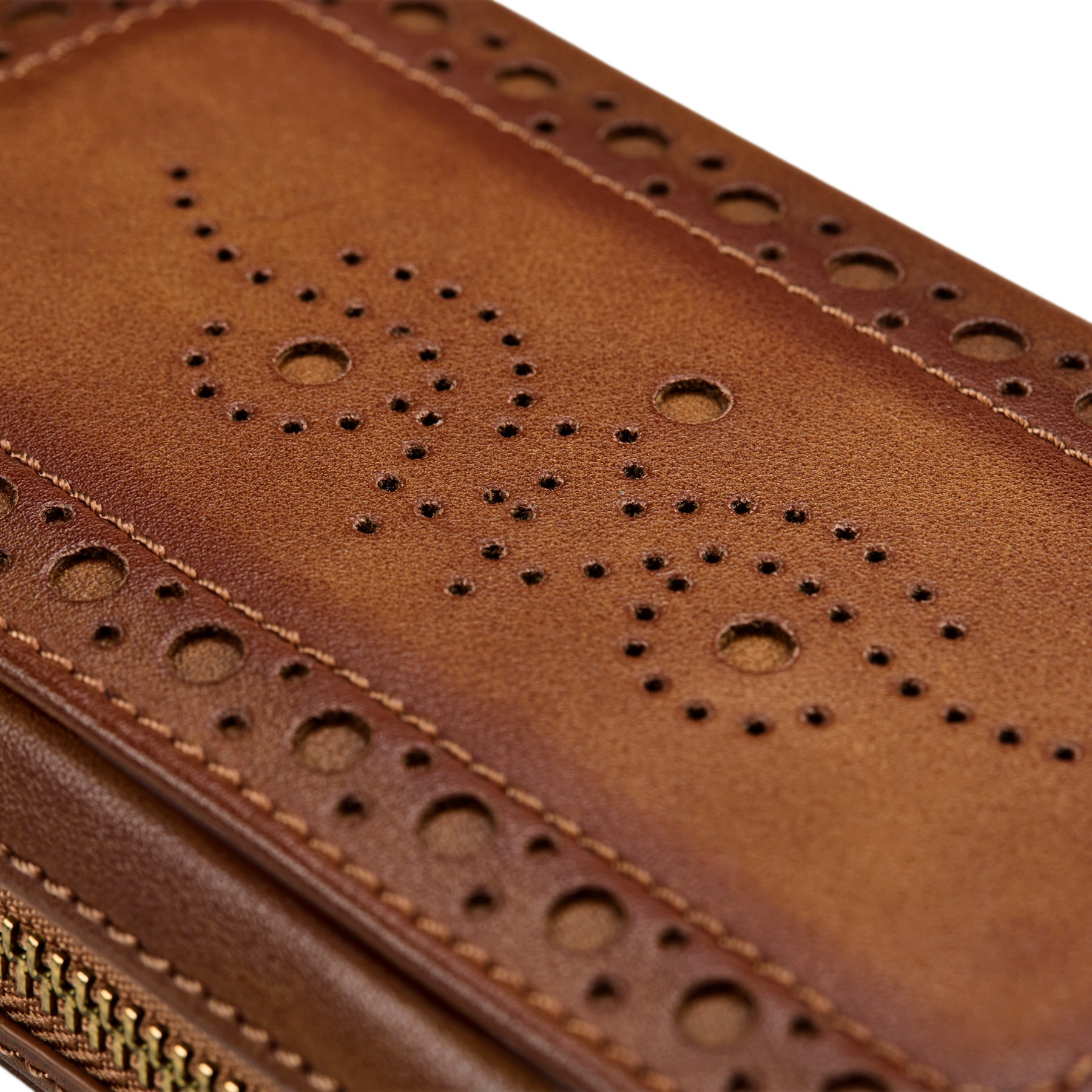 Brogue 2 Piece Watch Zip Case was inspired by the traditional brogue patterns on handmade English shoes, featuring two padded compartments, secure closure, and burnished plant-based material finish with brass hardware.