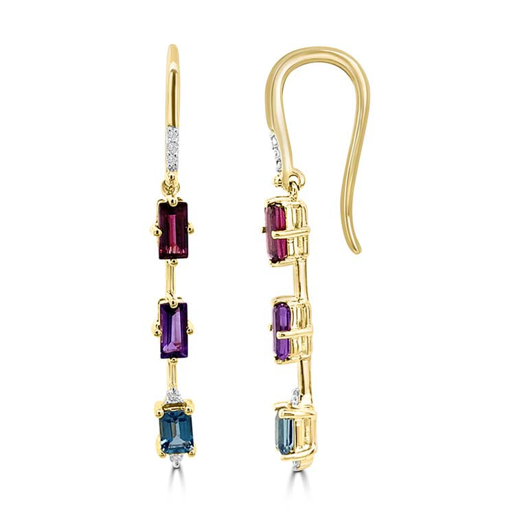 Diamond, Rhodolite, Amethyst, London Blue Topaz Drop Earrings with 0.05ct Diamonds in 9K Yellow Gold