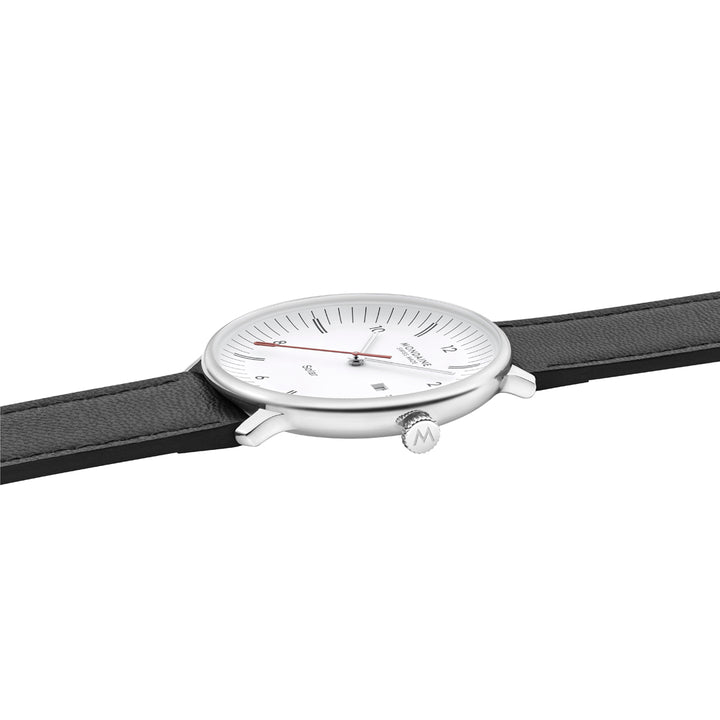 This watch combines timeless Swiss design with forward-thinking innovation. Featuring a 41mm case crafted from 316L stainless steel with up to 91% recycled content, this watch is powered by an innovative solar movement. Beneath the dial, solar cells harness both natural and artificial light, storing energy in a rechargeable battery. This stored energy powers the watch, eliminating the need for regular battery replacements and promoting eco-friendly timekeeping. A fully charged battery can power the watch for approximately 8 months, even without additional exposure to light. The concave matt white dial with a light transparency is paired with a double-domed sapphire crystal creating striking depth and elegance. The design plays with the concept of duality featuring double lines on the hands and indexes and on the tip of the second-hand. The date window and water-resistance up to 5 ATM add practical functionality to the timepiece. The black strap is made from organic wine production waste. With its effortless blend of vintage charm and eco-conscious innovation, this timepiece redefines sustainable watchmaking.