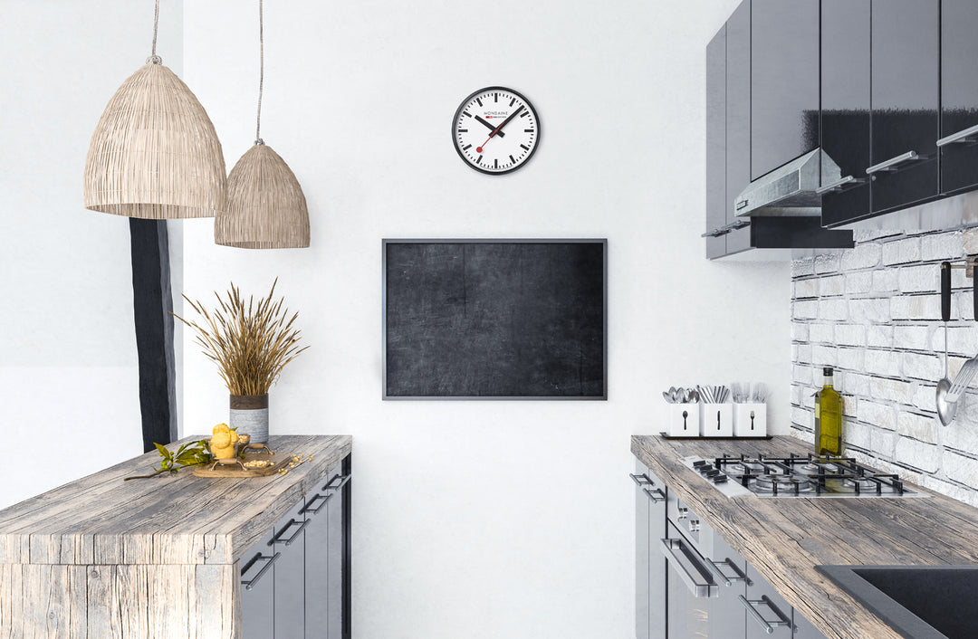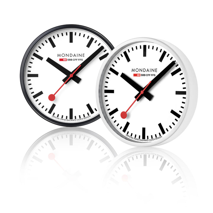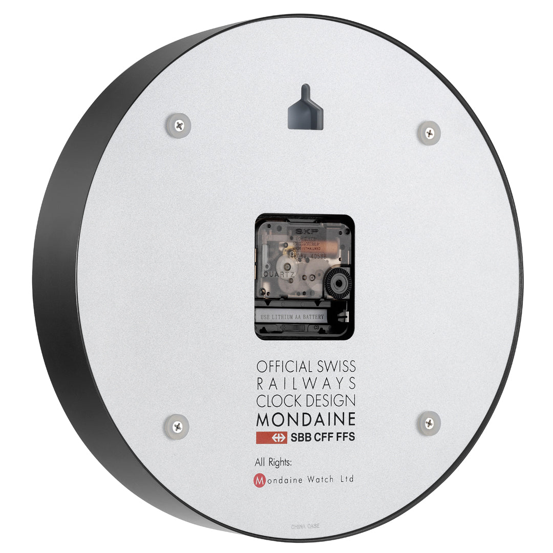 A true icon of Swiss design, this MONDAINE Official Swiss Railways Clock comes in a 25cm size with a crisp black matte aluminium frame. Inspired by Hans Hilfiker’s legendary 1944 design, this wall clock features the instantly recognizable minimalist dial, bold black hands, and sweeping red second hand for smooth, silent movement. Crafted with a hardened mineral crystal and dust-resistant case, it blends form and function in perfect harmony. Its timeless look enhances any space—from modern homes to professional interiors—while showcasing MONDAINE’s commitment to precision, quality, and craftsmanship. This clock is more than a timekeeper—it's a piece of design history.